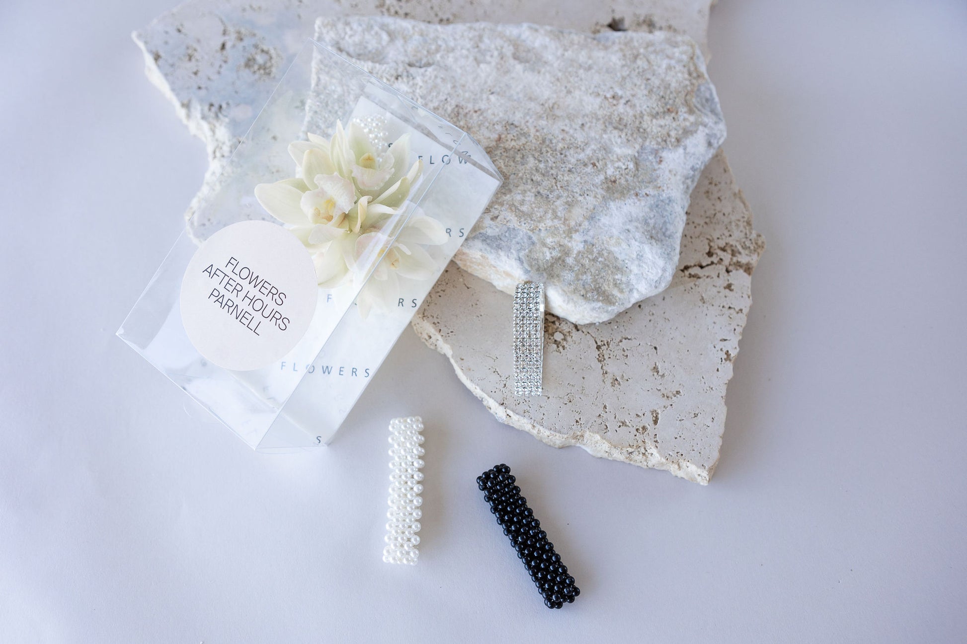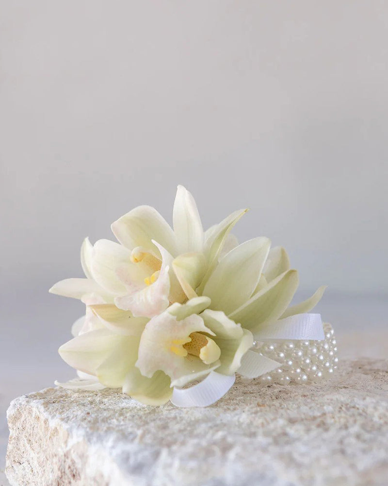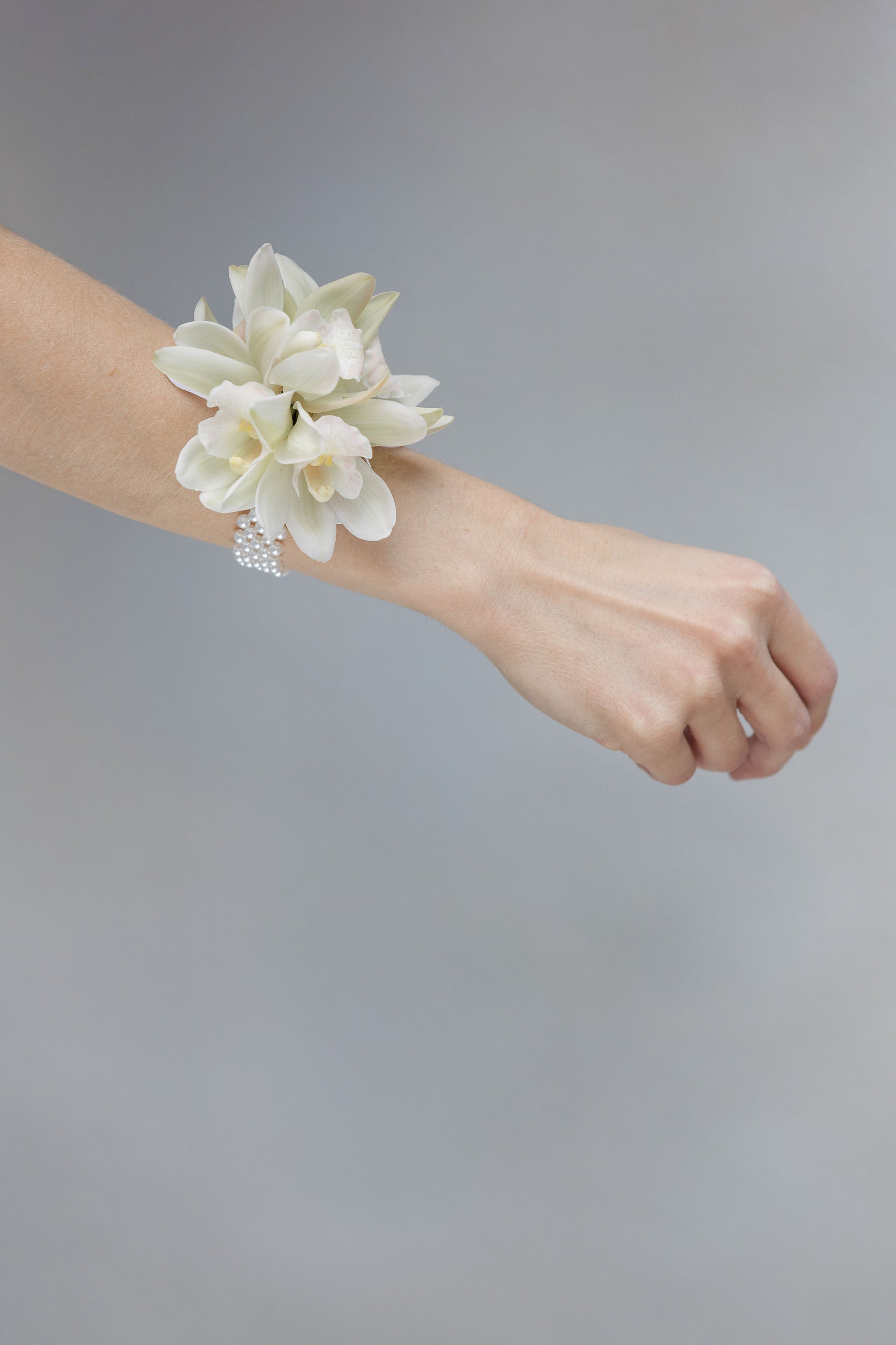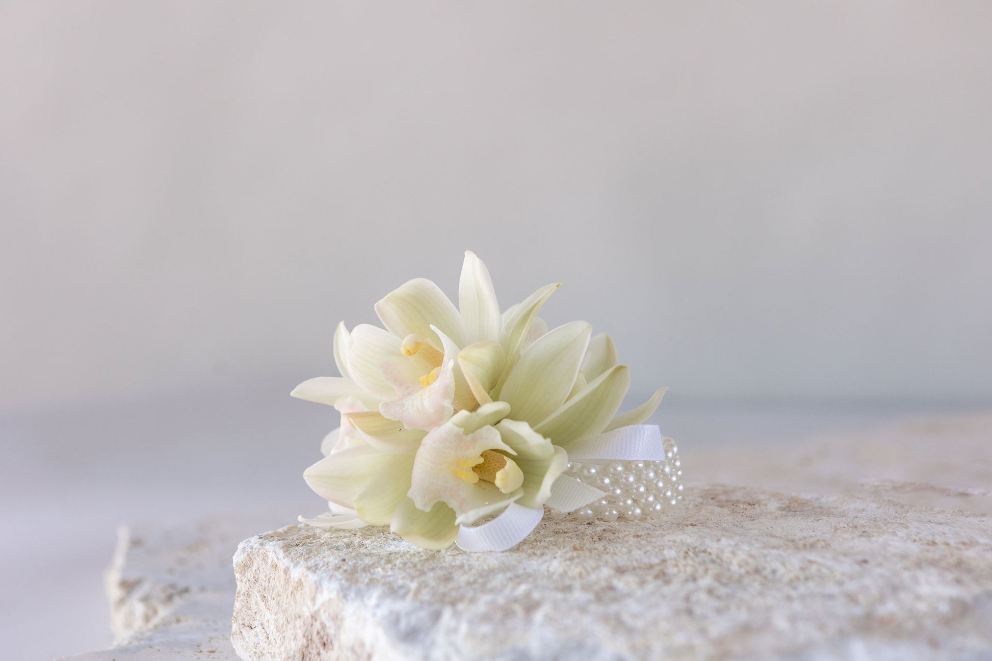 Our wrist corsages are hand made with beautiful mini white orchids. A stunning accessory to compliment your dress, choose from three different styles of wrist band.