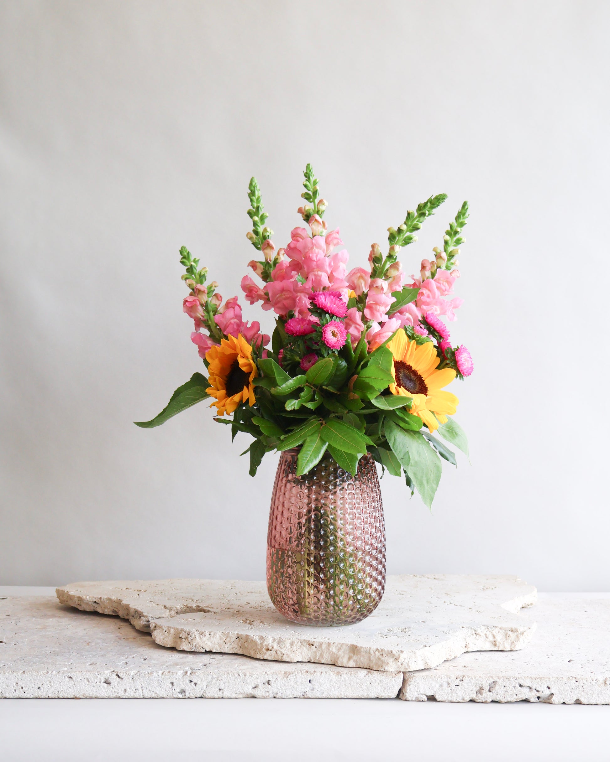 Tall pink snapdragons add height and movement, vibrant hot pink asters bring playful bursts of colour, while glowing sunflowers create a bold, happy contrast against layers of lush greenery. The result is fresh, vibrant and uplifting — a bouquet that feels joyful and effortlessly beautiful.