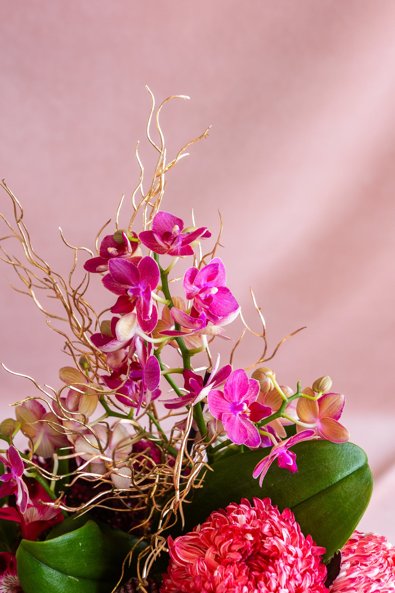 Fresh seasonal flowers in feminine framboise-inspired tones — including shades of pink, raspberry, and soft green through blooms such as chrysanthemums and alstroemeria