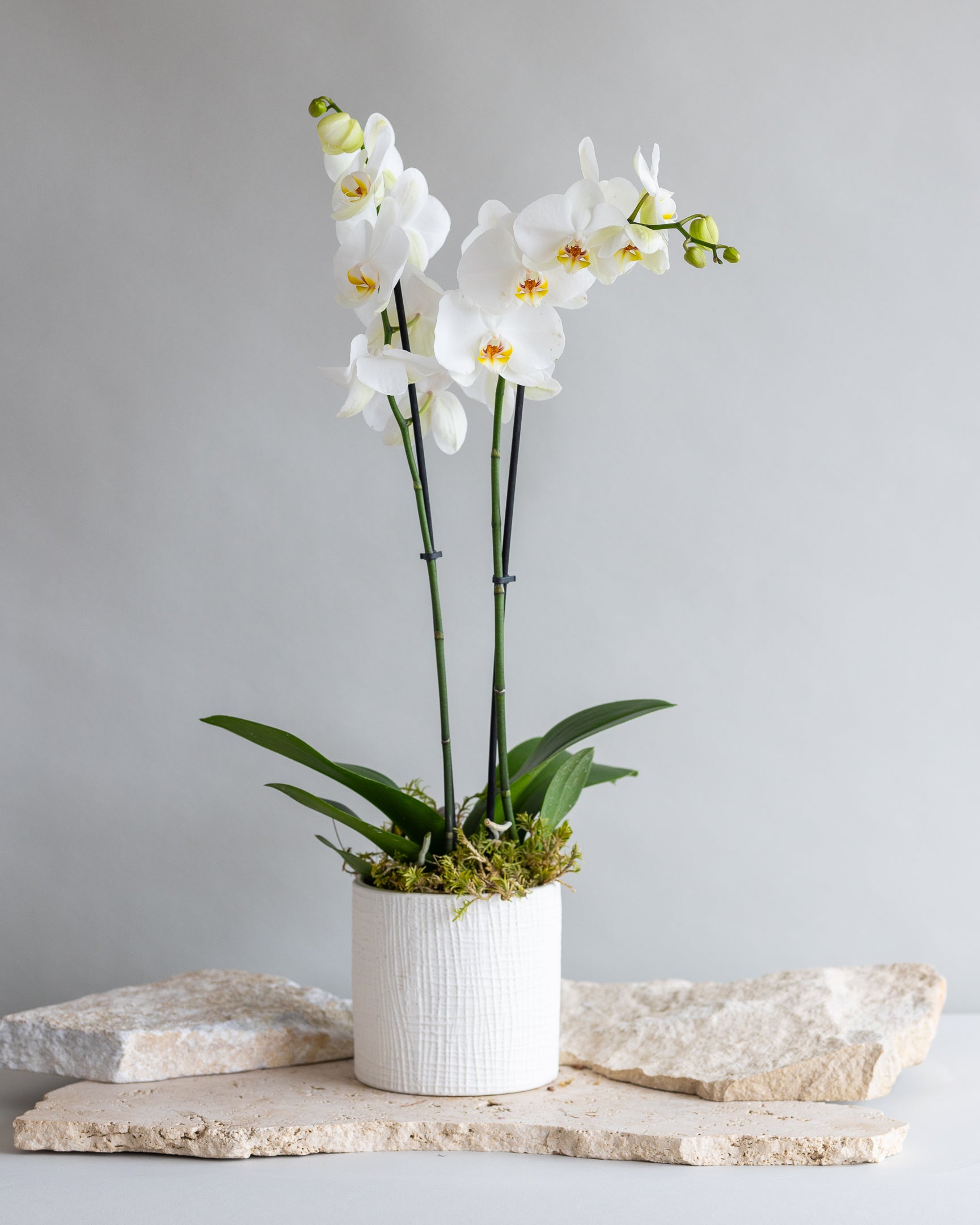 A serene display of pure white Phalaenopsis orchids, this plant features two graceful stems adorned with soft, cascading blooms accented by warm golden centers. Nestled in a textured white ceramic planter crafted with 20% recycled material, it brings a clean, modern elegance to any space while reflecting a thoughtful, sustainable touch.