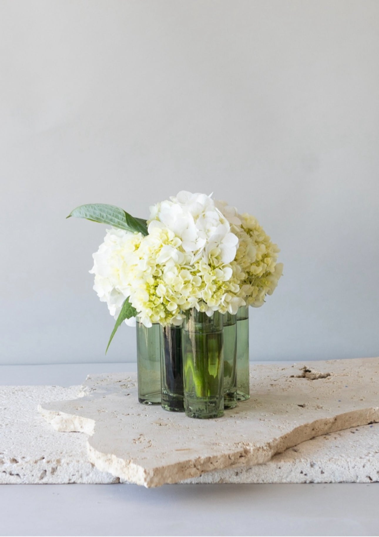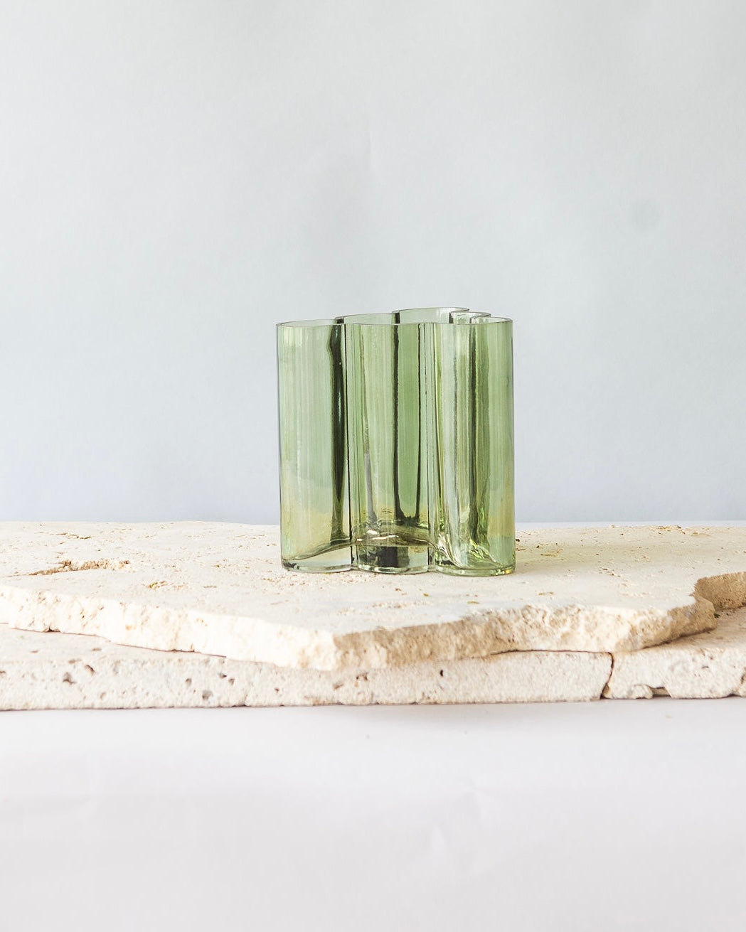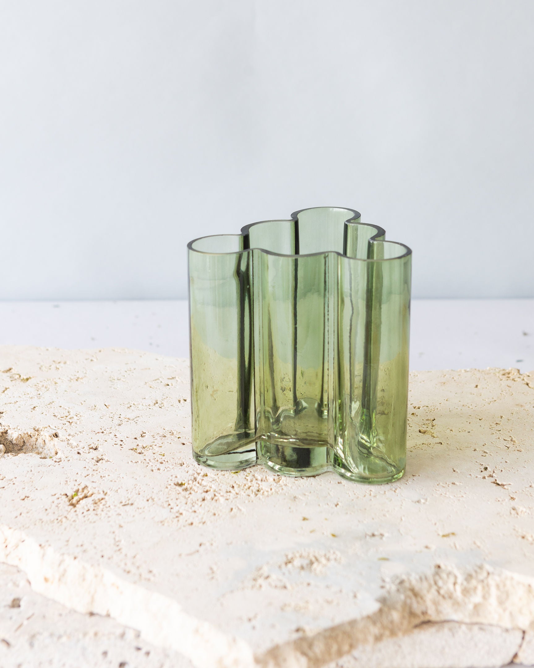 The Trevi Retro Glass Vase captivates with its vintage charm, featuring a scalloped structure. Its transparent green glass casts a serene glow, perfect for showcasing shorted stemmed blooms or adding a splash of nostalgic elegance to your decor.